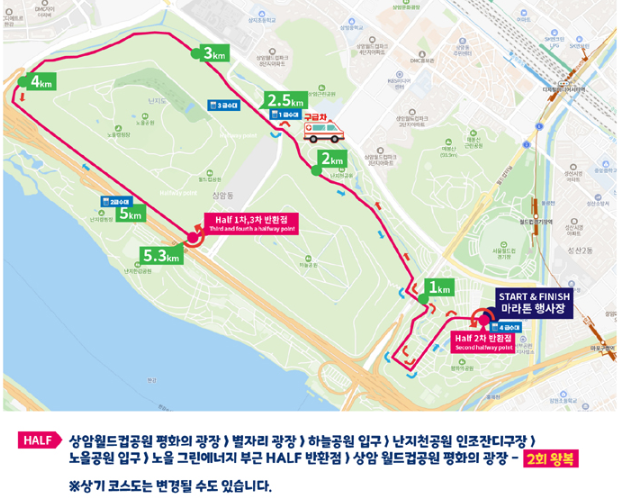 - HALF 코스 : 상암 월드컵공원 평화의 광장 - 별자리 광장 - 하늘공원 입구 - 난지천공원 인조잔디구장 - 노을공원 입구 - 노을 그린에너지 부근 HALF 반환점 - 상암 월드컵공원 평화의 광장 [2회 왕복]