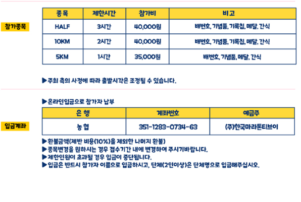 | HALF | 3시간 | 40,000원 | 배번호, 기념품, 기록칩, 메달, 간식 |