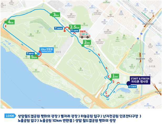 - 10KM 코스 : 상암 월드컵공원 평화의 광장 - 별자리 광장 - 하늘공원 입구 - 난지천공원 인조잔디구장 - 노을공원 입구 - 노을공원 10km 반환점 - 상암 월드컵공원 평화의 광장