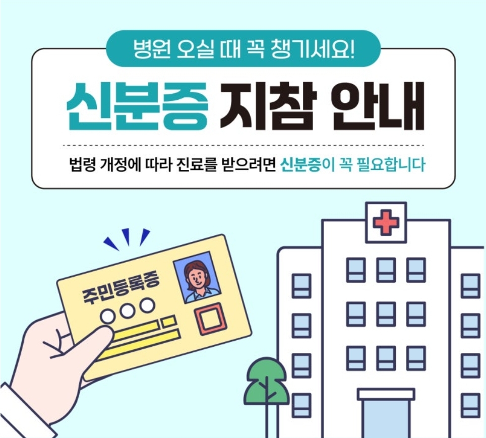 병원, 약국 방문 시 신분증 필요 건강보험 부정수급 방지를 위해 국민건강보험 개정에 따라 병·의원 방 문 시 본인 확인 절차가 강화되었습니다.